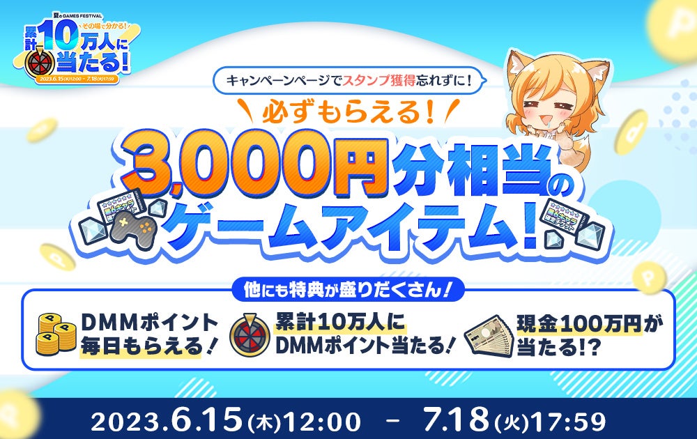 【夏のDMM GAMES FESTIVAL】最大10,000ポイント当たるルーレットや現金100万円応募も!20人に1人に10%分のポイント還元も!ゲームプレイでアイテム3,000円分相当も!詳細は特設サイトで!