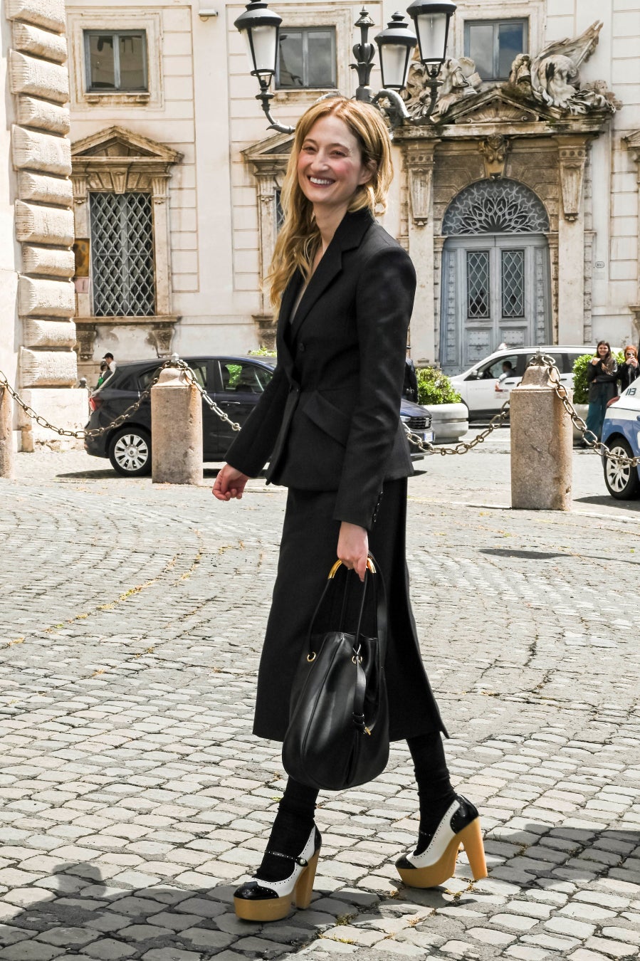 アルバ・ロルヴァケルは、ベージュのトレンチ生地のアシンメトリーなドレープビスチェとパンツ、そしてブラックのウールとシルクのジャケットとスカートを着こなしました。