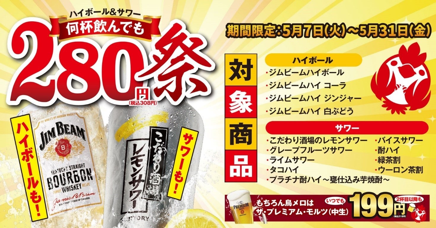 ワタミが展開する「三代目 鳥メロ」では、2024年5月7日から31日まで「280円祭」を開催します。