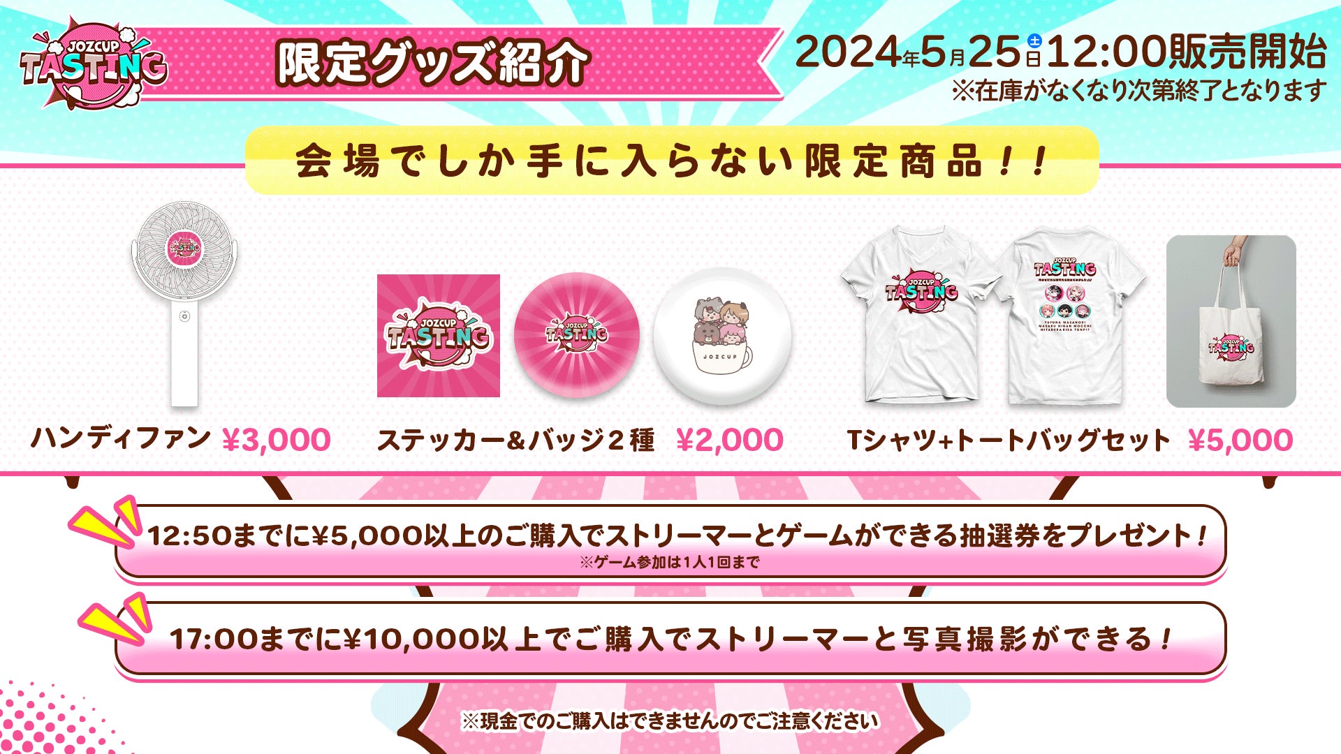 - JOZ CUP TASTING、アフターパーティー参加権、販売期間、電子マネー、クレジットカード、ゲーム抽選券、写真撮影