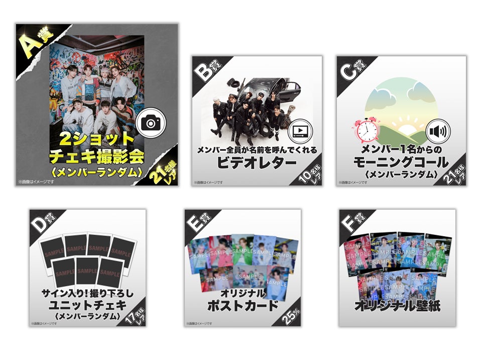 賞品には2ショットチェキ撮影会やメンバーからのビデオレター、モーニングコールなどが含まれ、さらにオリジナルポストカードや壁紙も当たります。