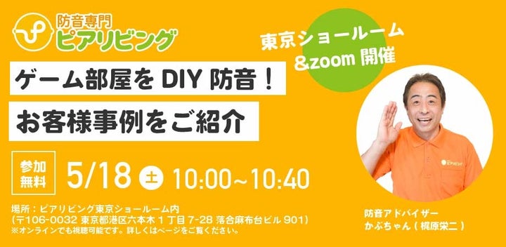 株式会社ピアリビングは2024年5月18日に「ゲーム部屋のDIY防音セミナー」を開催します。