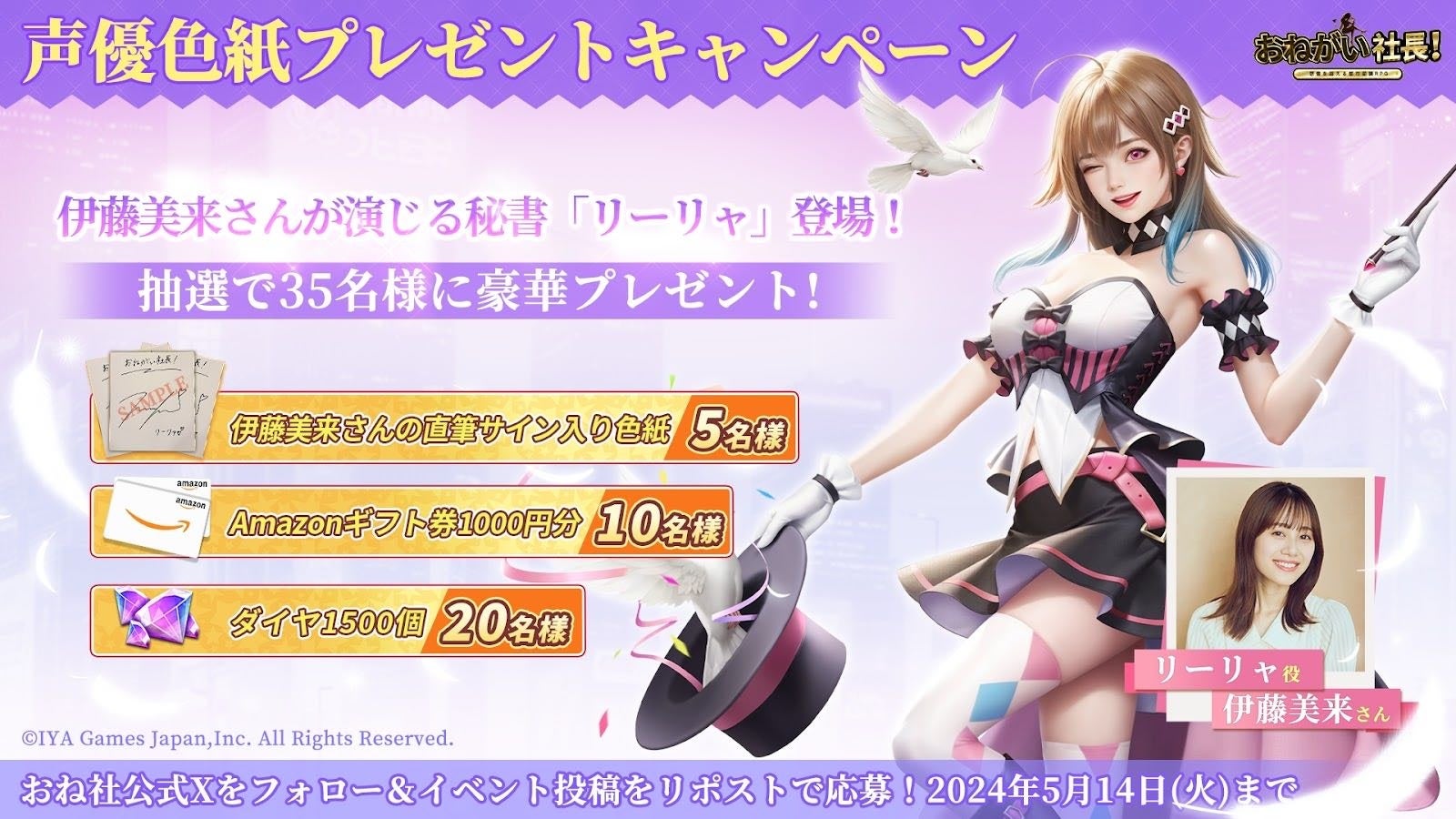 声優の伊藤美来さんが新キャラクター「リーリャ」として「おねがい社長!」に登場!リーリャは魔術好きの新人マジシャンで、日々努力中。