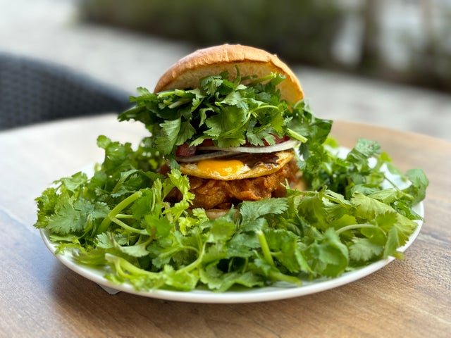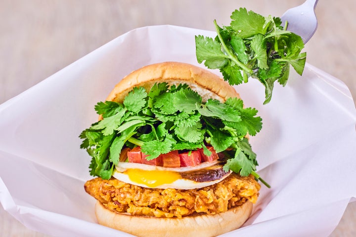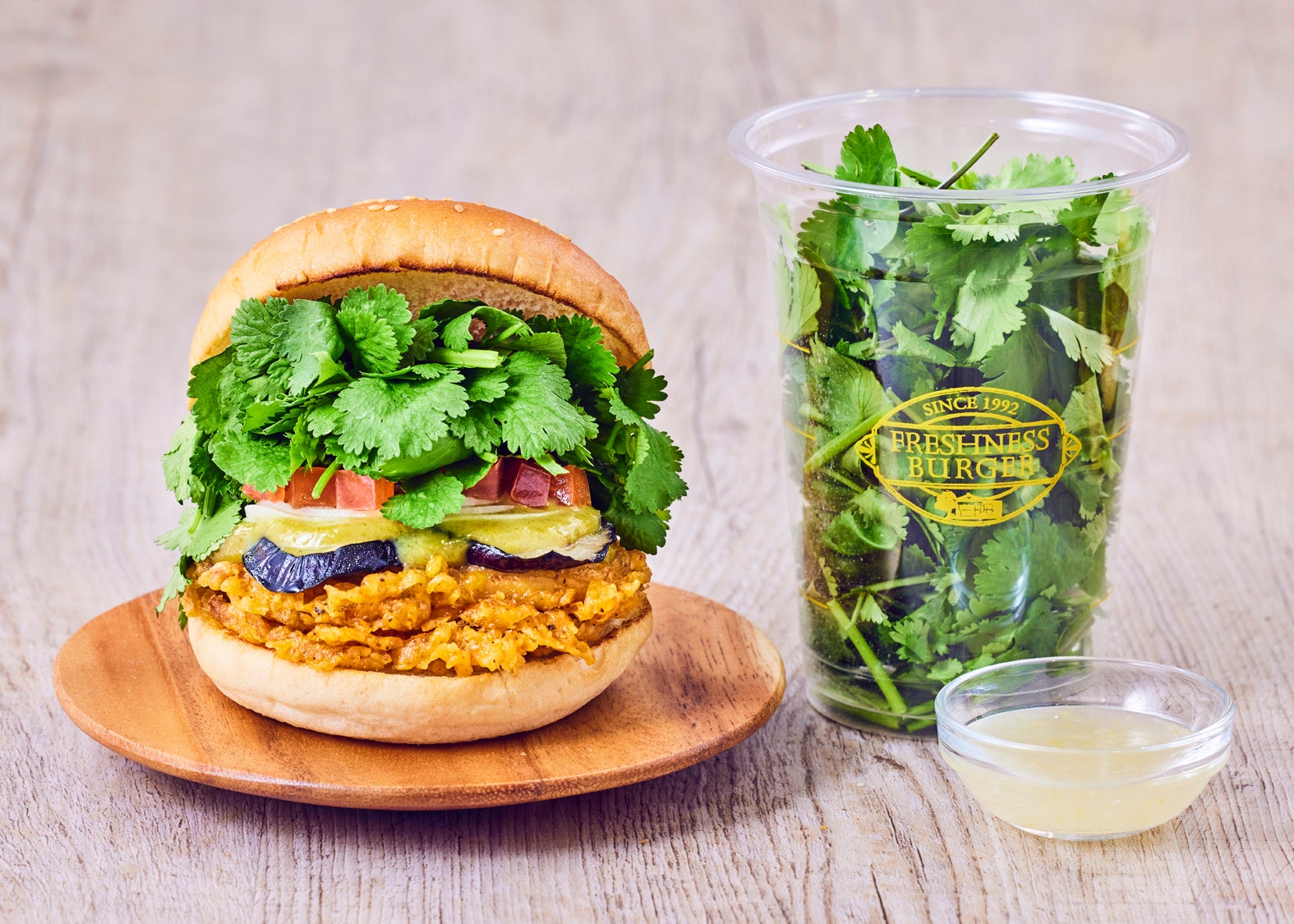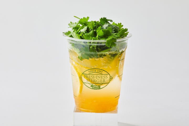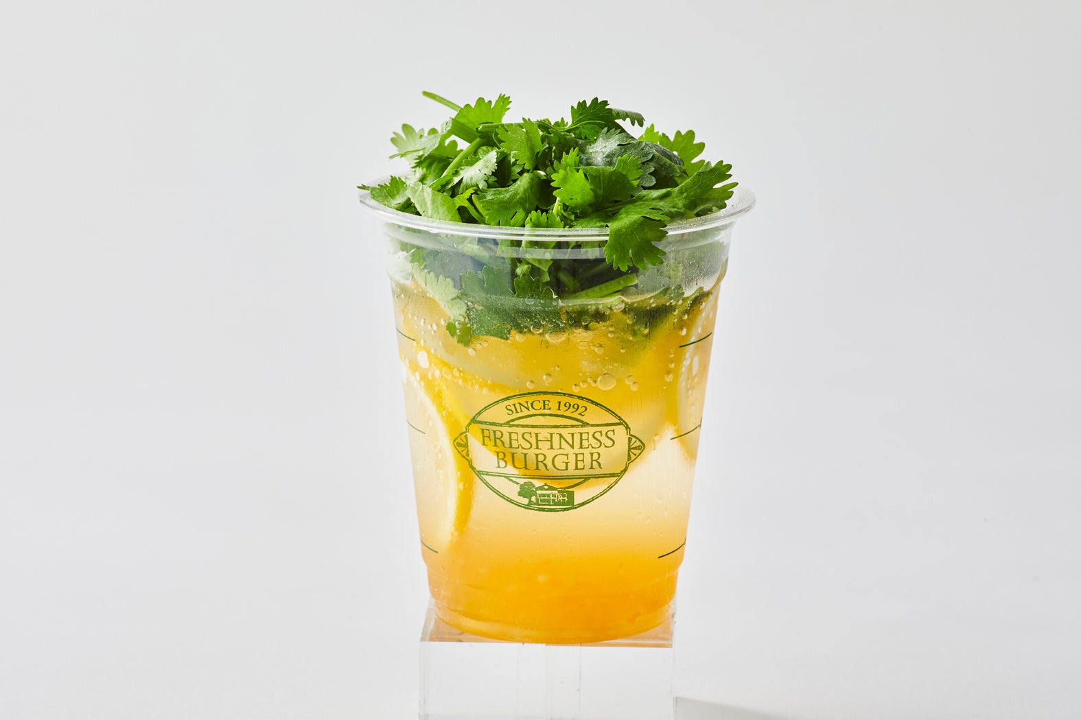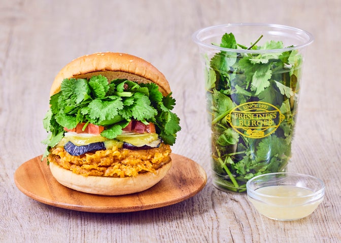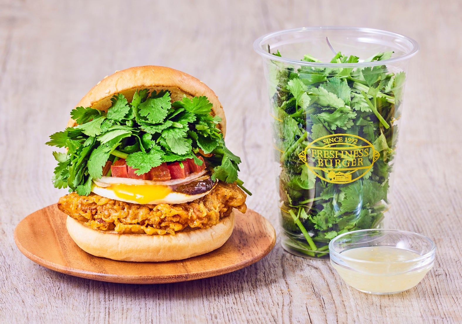 - パクチー、瀬戸内産の爽やかな塩レモンソース、パクチーチキンバーガー、フライドチキン、トムヤムクンポテト、フローズンライムグァバレモネードソーダ