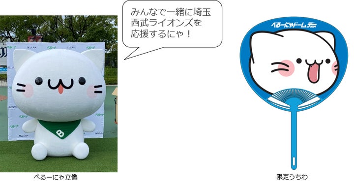 ベルーナ公式キャラクター「べるーにゃ」が会場に登場し、オリジナルべるーにゃうちわの限定配布や、西武ブルーユニフォームの右袖にべるーにゃがデザインされた限定ユニフォームの配布も行われます。