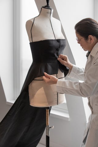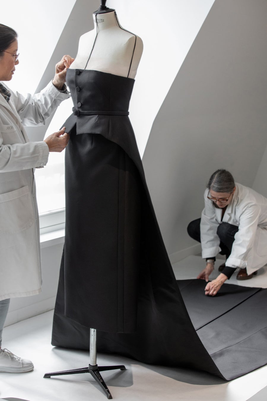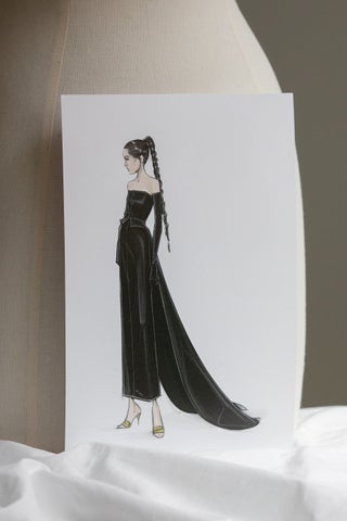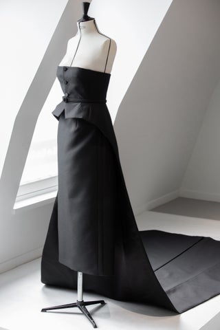 1800時間かけて制作されたブラックウールとシルクのビスチェにロングトレーンとスカートを合わせ、ディオールの「ディオール デリカ」ネックレスを着用していました。