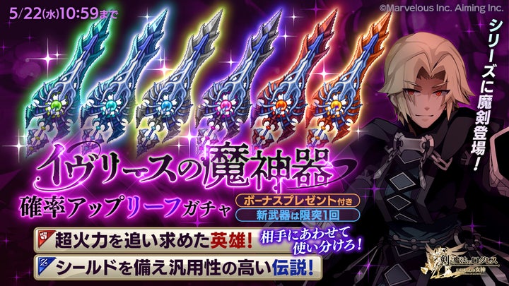 「イヴリースの魔神器確率アップリーフガチャ」では、6属性の魔剣が登場し、英雄と伝説のレアリティが特徴です。