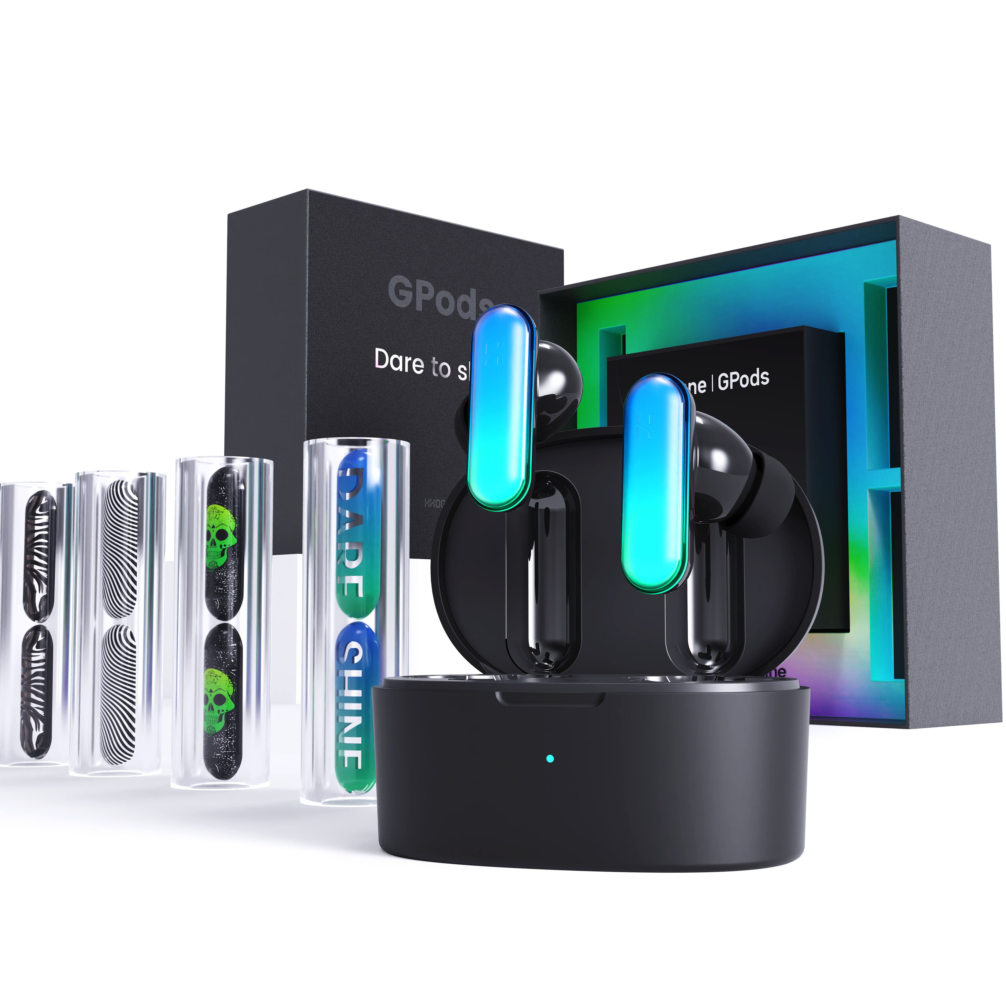 「GPods」は、RGBライトバーを備え、好みに合わせて専用アプリで色を選べることに加え、AIで保存した画像から色配列を作成することができます。また、色だけでなく、ライトの上からデザインシェルをつけることもでき、30万通りからその日のファッションや気分に合わせてデザインをカスタマイズし、アクセサリー感覚でご使用いただけます。さらに、臨場感のあるサウンドを実現するオーディオや、10分の充電で約2時間連続再生が可能な急速充電機能、ノイズキャンセリング機能、防水機能など、充実の機能も備えるコストパフォーマンスの高い製品です。