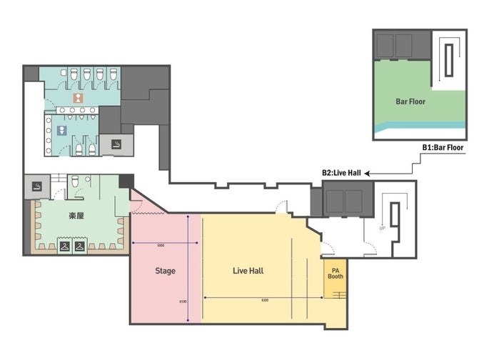 バンドスタジオやライブハウスから徒歩3分の好立地に位置し、B1・B2に吹き抜けの天井高やLEDパネルを備え、イベント演出にも対応しています。