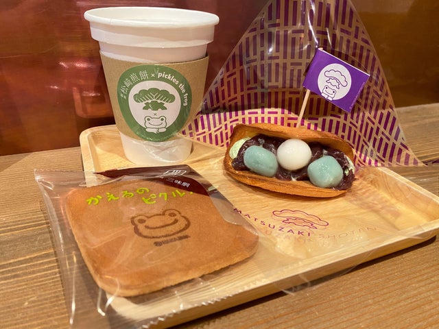 特別コラボメニュー「松﨑ろうる」は、柔らかい瓦せんべいを使用したスイーツで、かえるのピクルスverも登場。