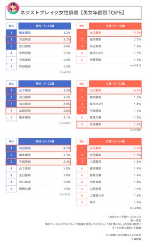 男性回答者によるランキングでは、15~18歳と23~24歳の層で菅田将暉が注目を集めています。