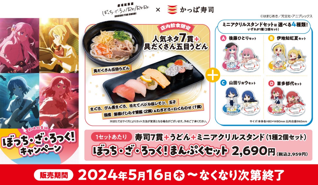 2024年5月16日から、かっぱ寿司がアニメ「ぼっち・ざ・ろっく!」とコラボした『ぼっち・ざ・ろっく!まんぷくセット』を販売します。