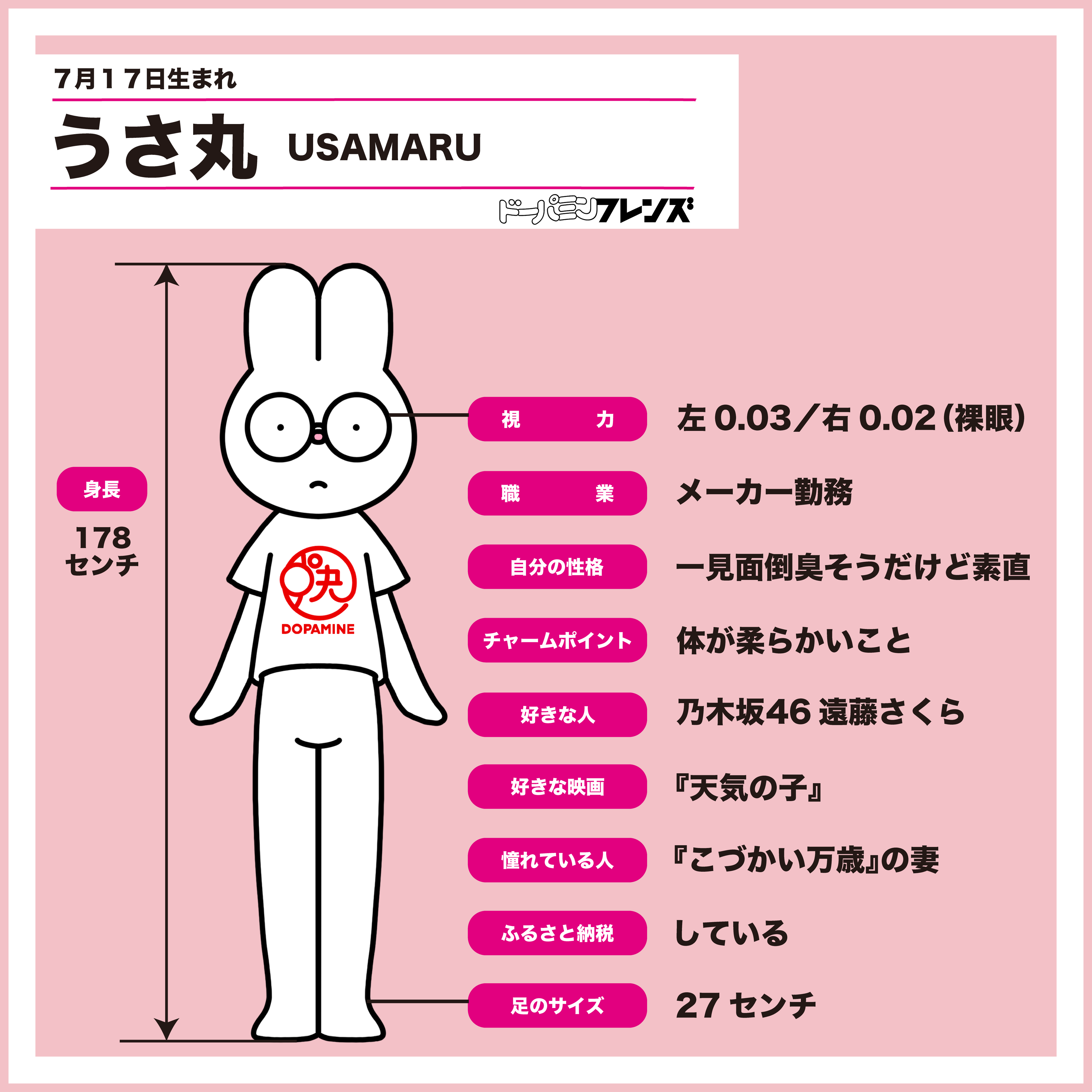 うさ丸は、ちょっと神経質で自己完結型だがユーモアセンスがある飲酒好き。飲酒記録をつけたり、飲酒読書をしたり、晩酌ライフを楽しんだりしている。ミニフライパンだけでおつまみを作ることが最近のマイブーム。