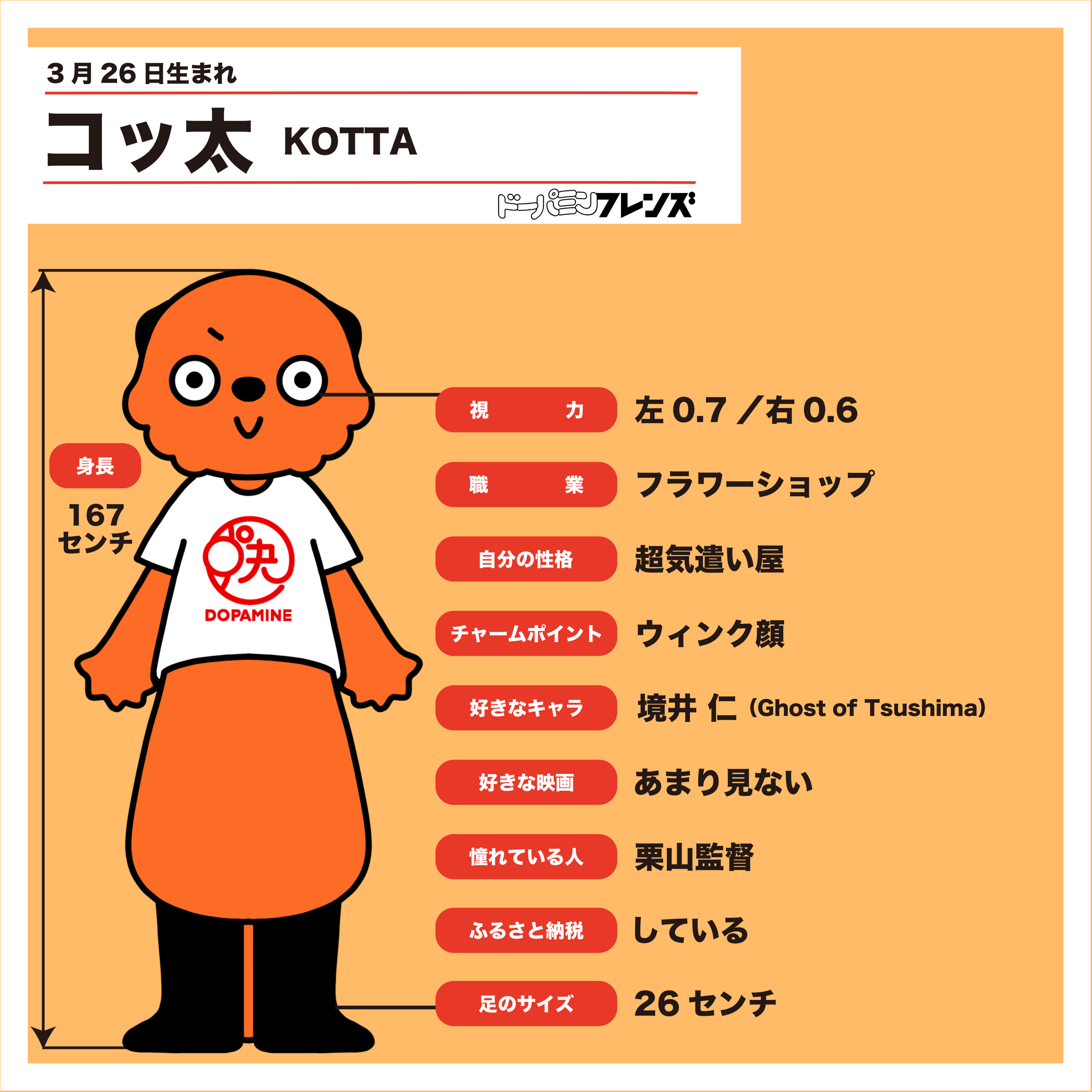 コッ太は、幼少期からコンシューマーゲーム、スマホゲーム、PCゲーム、アーケードゲーム等、様々なゲームジャンルを楽しみつくしてきたゲームオタク。基本的には、空気が読めて否定的な発言をしないおだやかタイプだが、ゲーム中だけは毒舌になる。