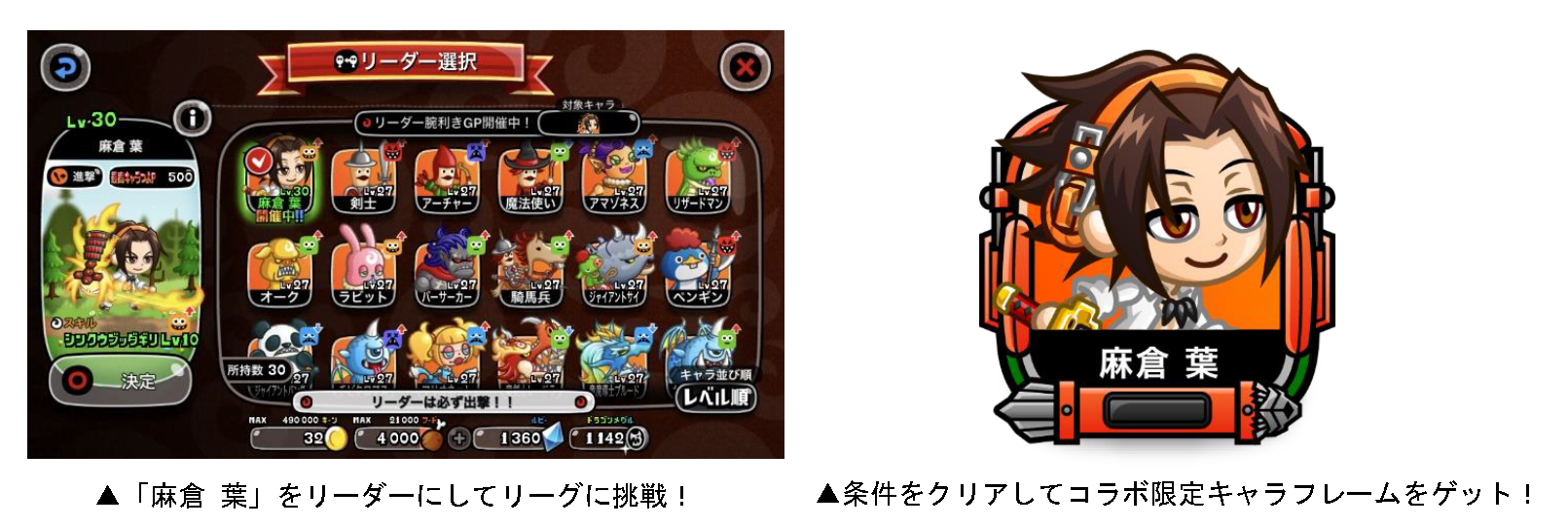 コラボ限定キャラ「麻倉 葉」をリーダーにしてリーグに挑む「リーダー腕利きGP」を開催いたします。バトルに勝利してより多くの「キャラフレP」を獲得したランキング上位者や条件を達成した方には、コラボ限定「キャラフレーム」が贈られます。