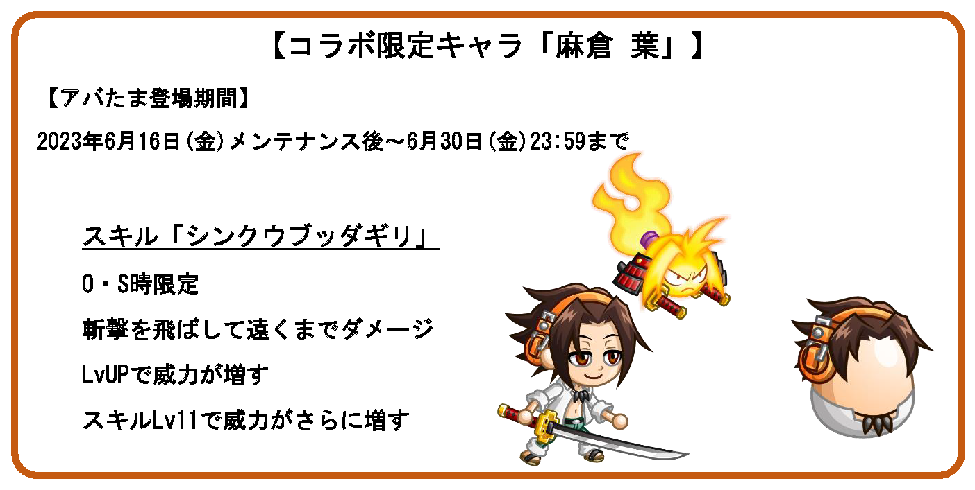 期間中は、コラボ限定キャラ「麻倉 葉」が「コラボのアバたま」に登場し、新たに「甲縛式O・S 白鵠」や、剣士専用の限定お着替え「ホロホロ」「木刀の竜」が登場する。