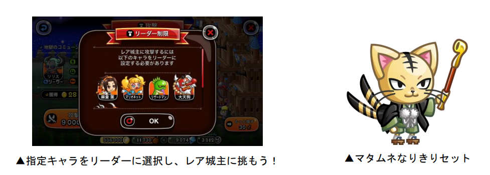 「バトル」から「ひとりで」または「みんなで」を選び、「攻撃」を選択すると、ランダムでレア城主が出現する「レア城主イベント」を開催いたします。まれに地獄のコミューンに遭遇し、規定数勝利をすると限定剣士お着替え「マタムネなりきりセット」がもらえます。