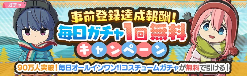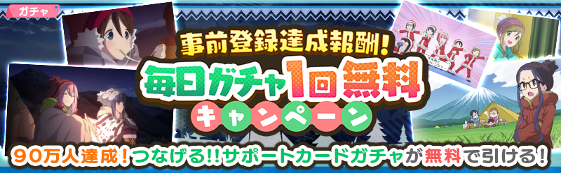 TVアニメ『ゆるキャン△』初のオンラインゲーム「ゆるキャン△ つなげるみんなのオールインワン!!」が全世界で100万、200万ダウンロードを突破し、ユーザーに★3確定ガチャチケットを1枚配布する。
