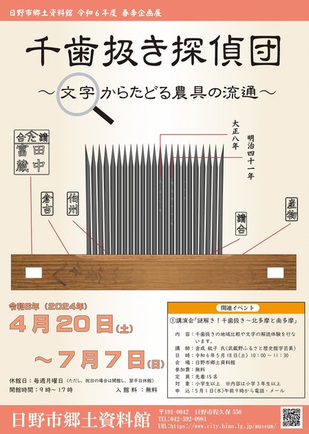 - 令和6年4月20日から7月7日、5月18日、千歯扱きの解読体験や地域比較を行う講座、小学生以上対象、15人、5月1日午前9時から電話受付
