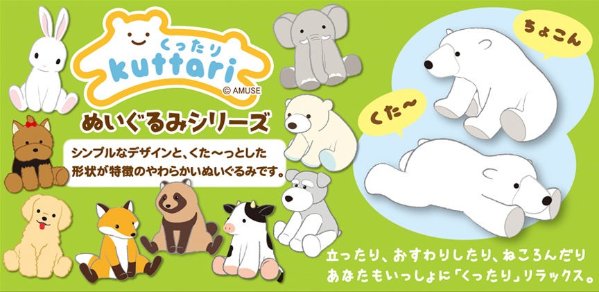 株式会社アミューズが展開する“くったりぬいぐるみシリーズ”の商品。シンプルなデザインと、くたーっとした 形状が特徴のやわらかいぬいぐるみです。