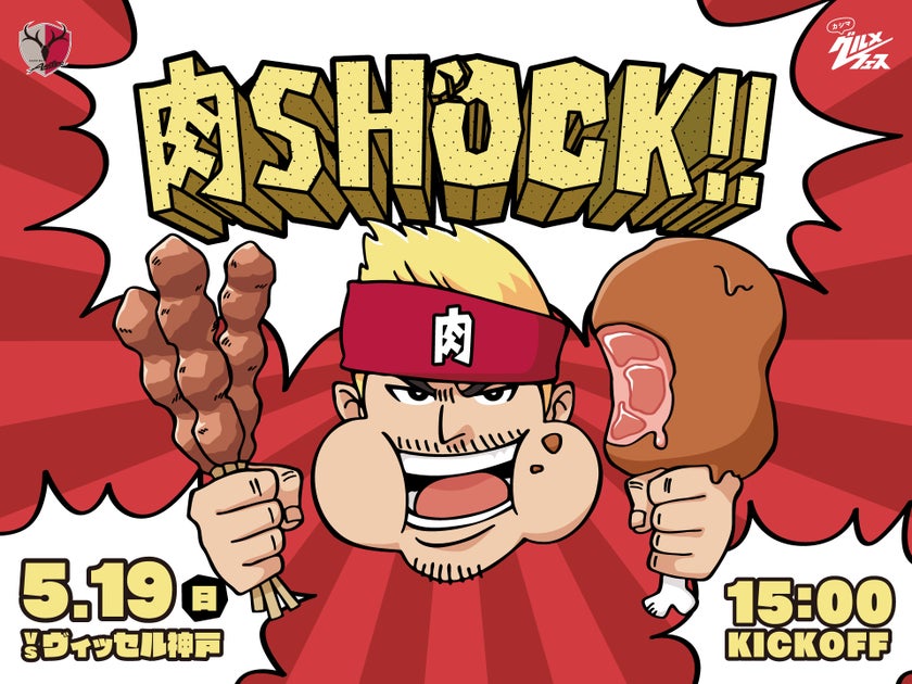 第1試合はヴィッセル神戸戦で、「肉SHOCK!!」がテーマとなり、限定グルメや抽選会が予定されています。