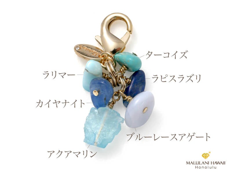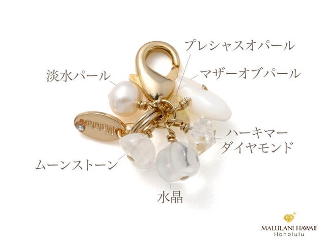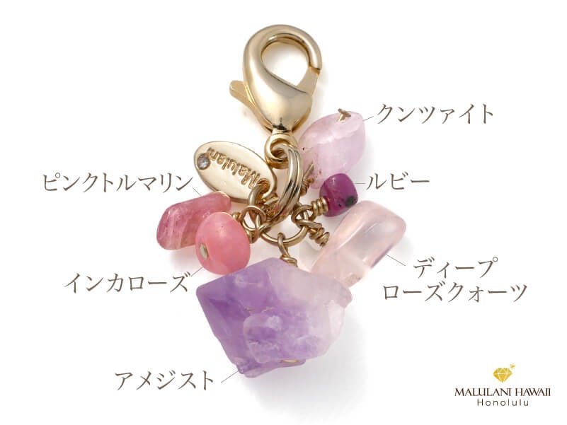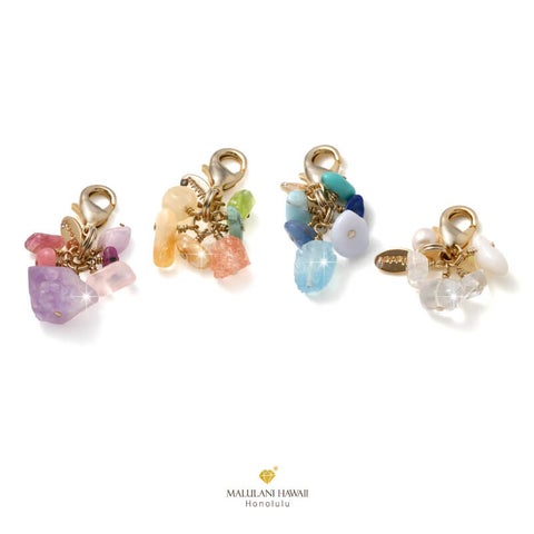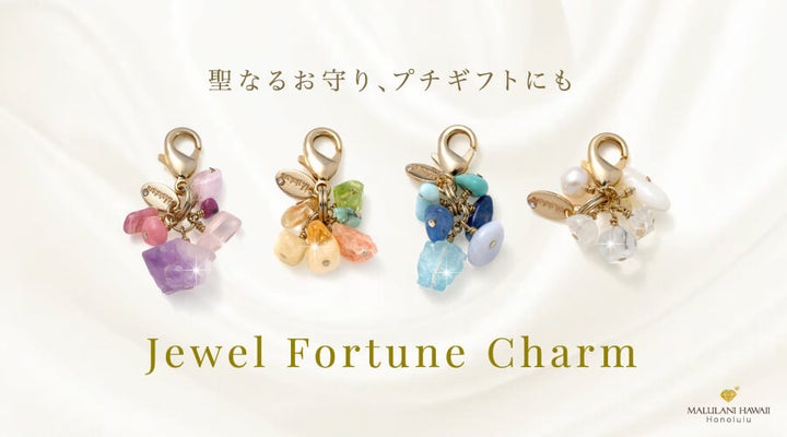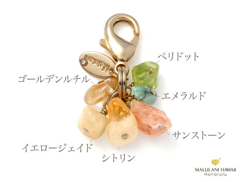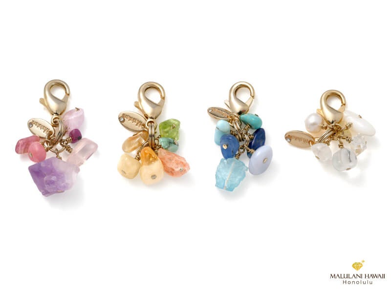 「ジュエルフォーチュンチャーム」は、天然石や真鍮メッキパーツを使用したストーンチャームで、恋愛や魅力、厄除け、金運、健康などさまざまな効果があります。
