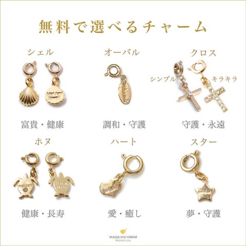 オリジナルチャームには「Malulani」という意味深い刻印が施され、神のご加護を願っています。