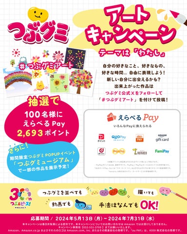 テーマは『わたし』で、自分らしさを表現するアートをつぶグミを使って作成し、SNSに投稿すると抽選で100名に選ばれるPay 2,693ポイントがプレゼントされます。