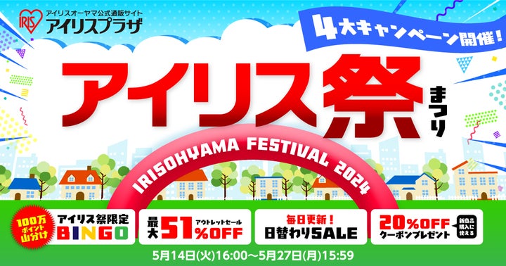 2024年のアイリス祭では、アウトレット商品のセールや日替わりストアセール、新商品購入に使える20%OFFクーポンの配布、ビンゴで豪華プレゼントが用意されています。