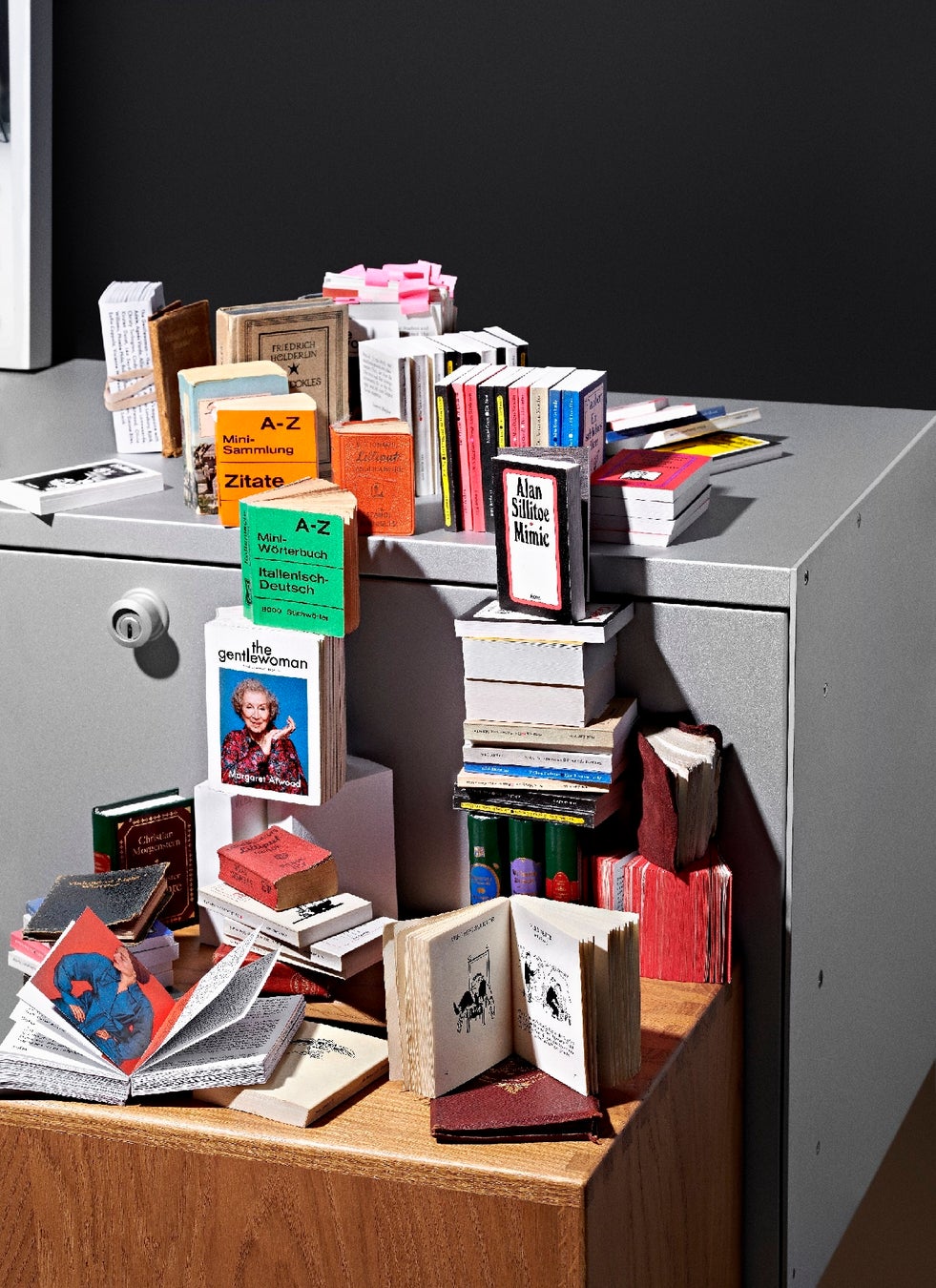 本や雑誌、展覧会用デザイン作品など幅広い作品が展示され、スタンドを使用して素材感や立体感を際立たせています。