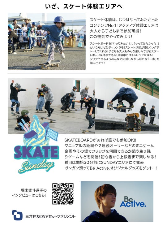 スケートボード体験や新しいエリア、スケートサンデーなど楽しいコンテンツが用意されています。