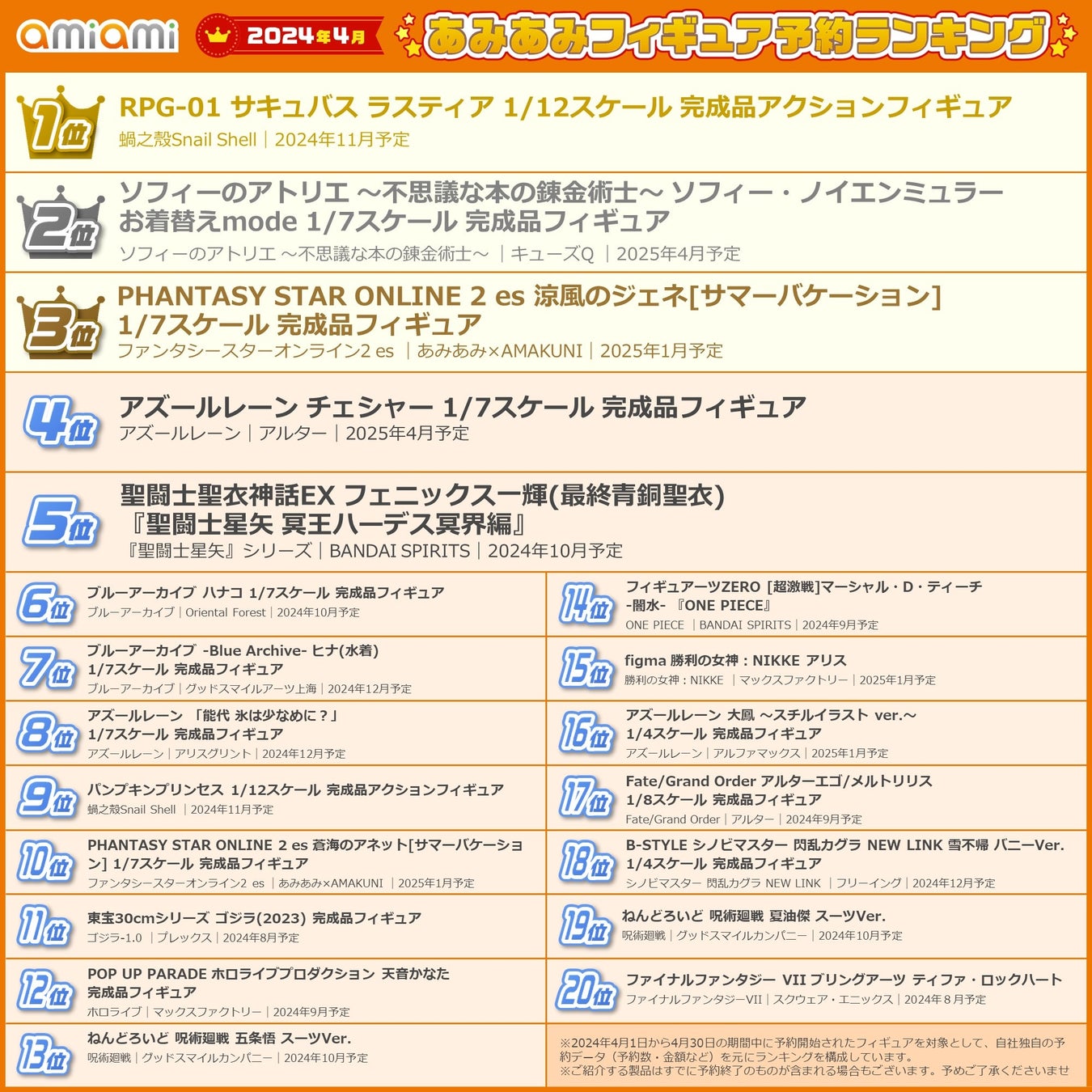 ホビーショップ『あみあみ』が運営する2024年4月のフィギュア予約ランキングが発表されました。