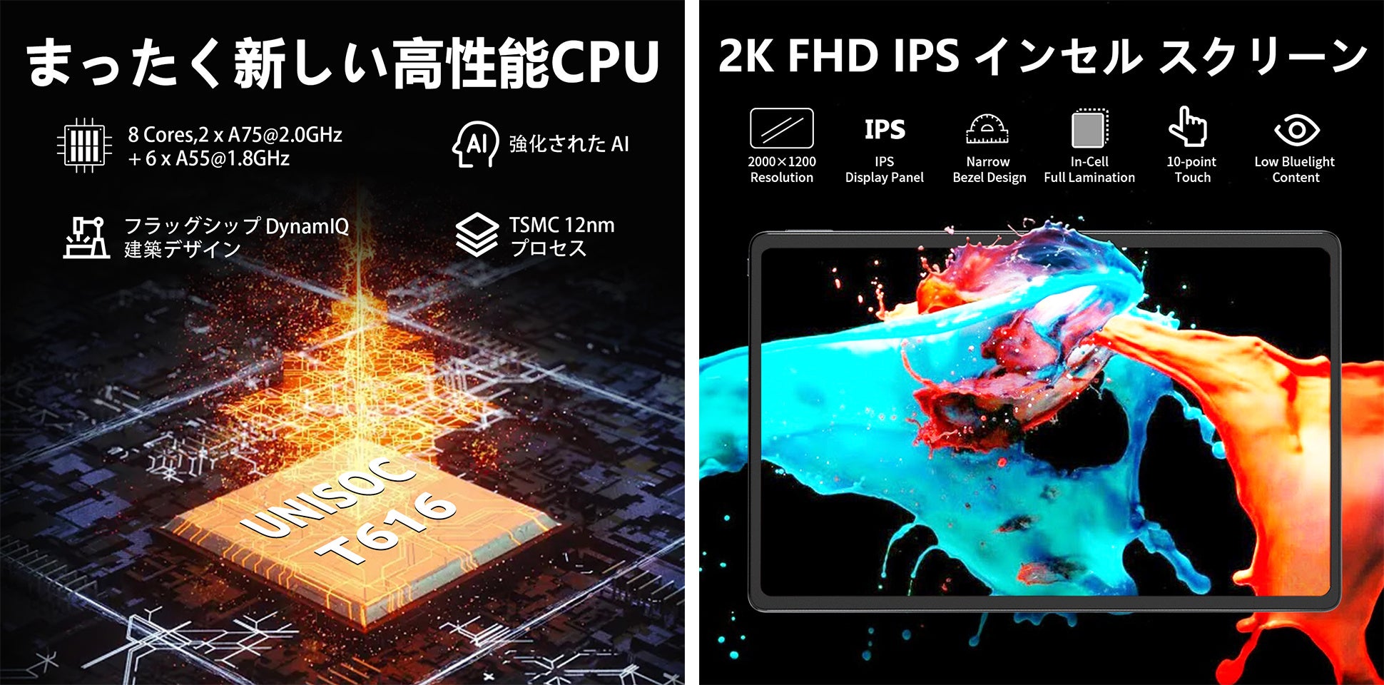 - 超高性能 8コア T616 CPU+10.4インチ 2K FHD IPS 大画面