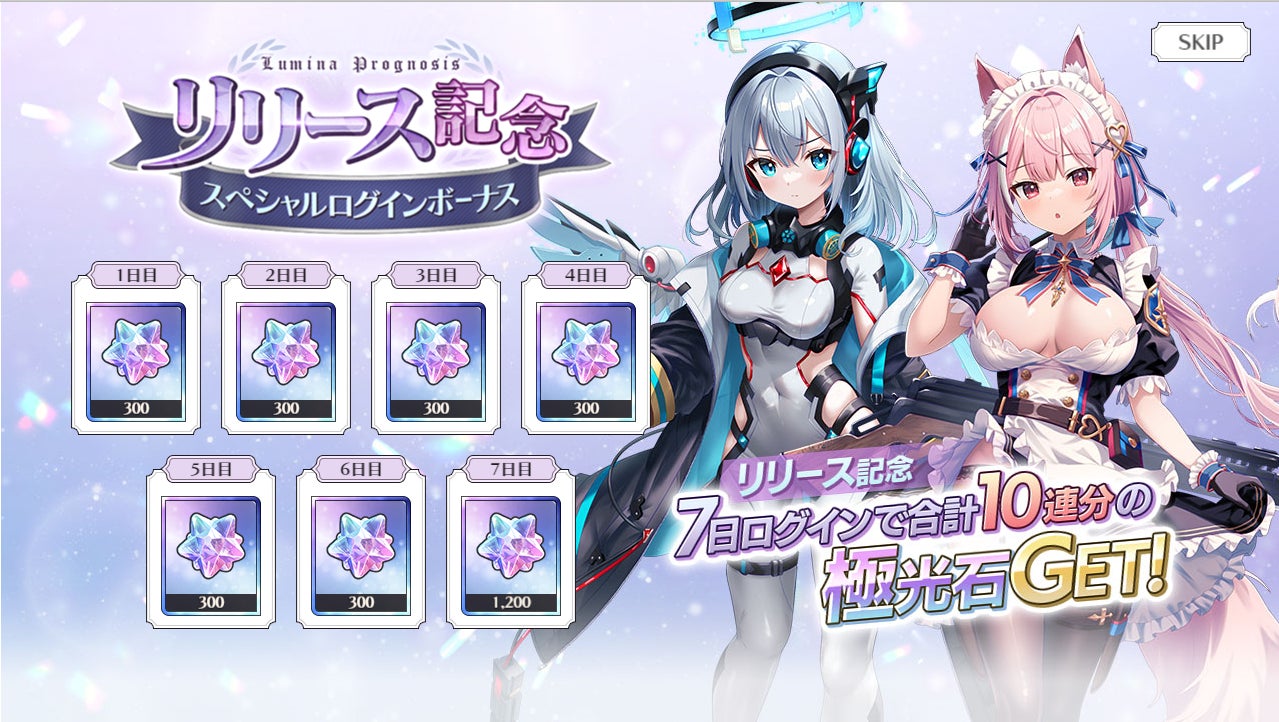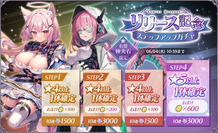 リリース記念としてログインボーナスや豪華キャンペーンを実施中で、さらにリリース記念商品やステップアップガチャも開催中です。