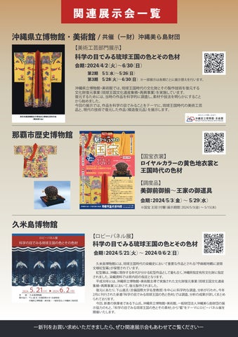 - 科学の目でみる琉球王国の色とその色材、美術工芸品、色材、紅型衣裳、織衣裳、143点の作品、琉球・沖縄の美術工芸品、染織作品、琉球王国の染織作品