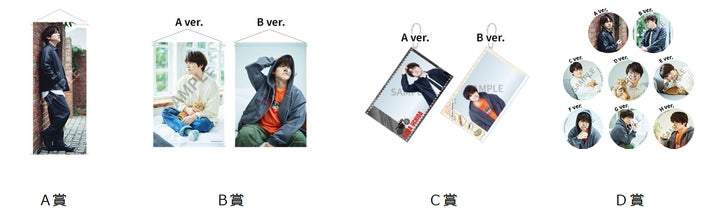 全身タペストリーやB2タペストリー、アクリルカード、缶バッジなどが揃い、賞品は先着順で終了となります。