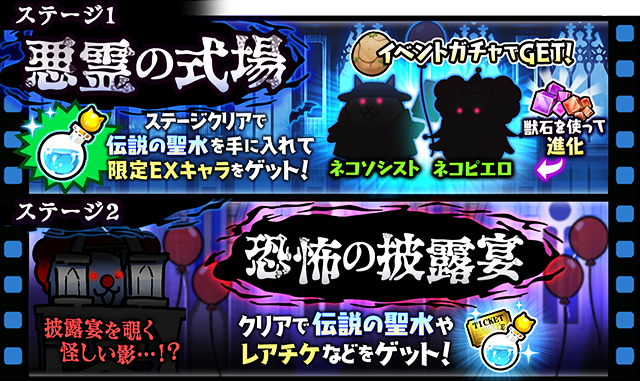 「伝説の聖水」を集めて第3形態で「ネコソシスト」に進化する「古びたタマゴ:N201」や「ネコピエロ」に進化する「古びたタマゴ:N203」などをゲットしましょう。