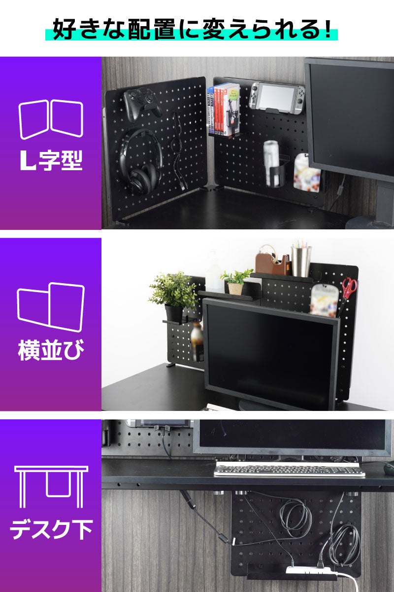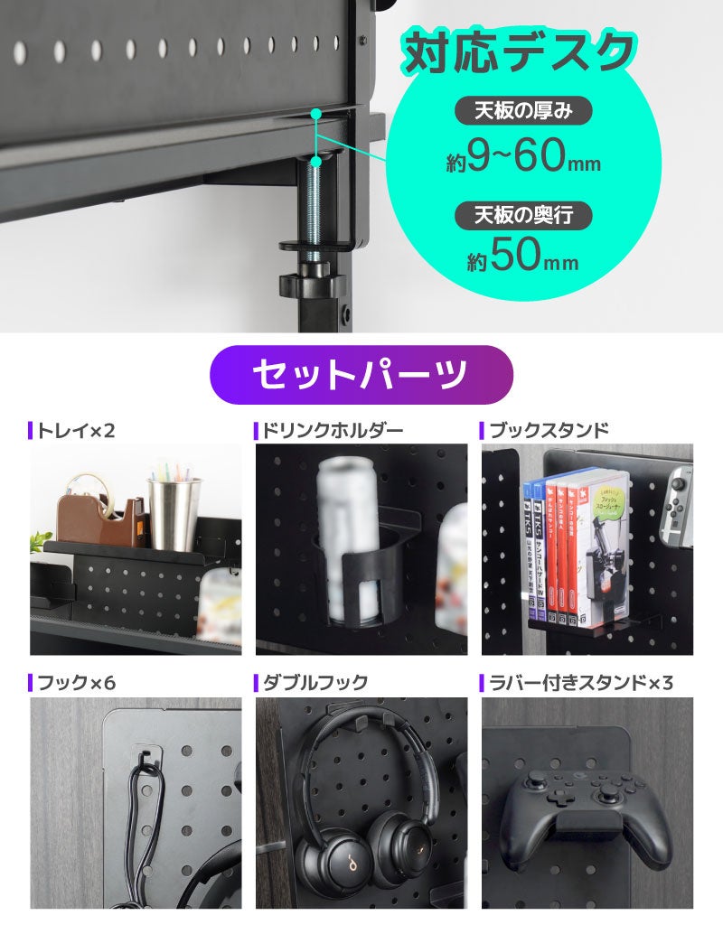 厚さ9~60mmの天板に対応。付属の金具で2枚のボードを横に連結したり、L時に連結することもできます。ボード1枚に横15個、縦12個の穴が30mm間隔で開いており、コントローラーが置けるスタンド、小物が置けるトレー、本を収納できるブックスタンド、ドリンクホルダー、フックなどのパーツが付属しお好きな位置にカスタマイズが可能。またお手持ちのフックをかけて使用も可能。スチール製の為、マグネットで固定もできます。