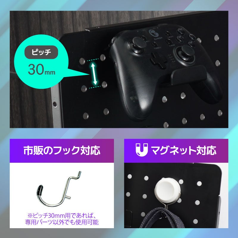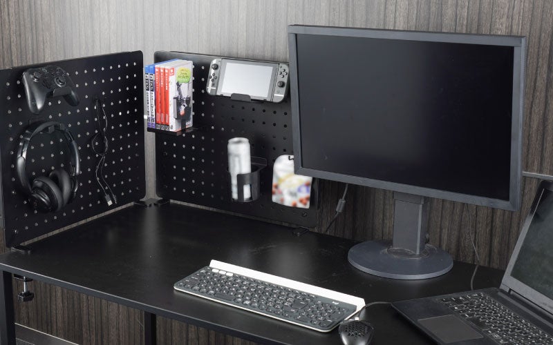 - スチール製有孔ボードでコントローラーや小物を収納可能