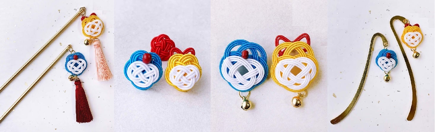 ピアス、イヤリング、ピンズ、かんざし、ブックマークがあり、絹巻水引を使用しています。