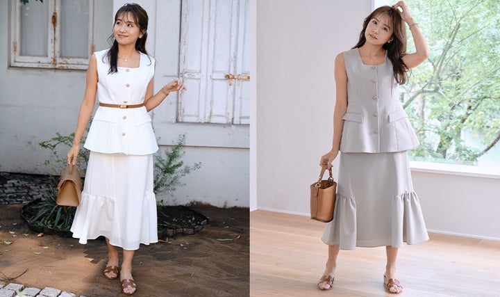 ジレはウエストラインを綺麗に見せるシルエットで、スカートは切り替えとギャザーがポイントです。