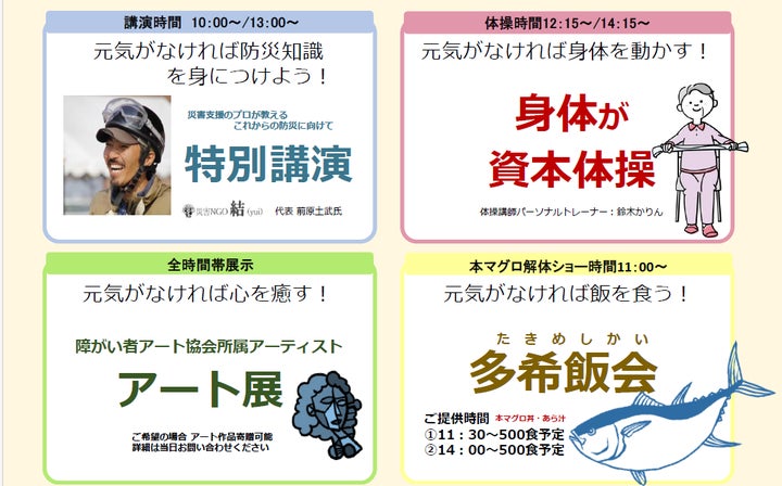イベントには本マグロ料理や体操、障がい者アート展などがあり、約1,200人が参加しました。