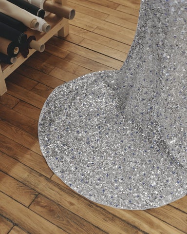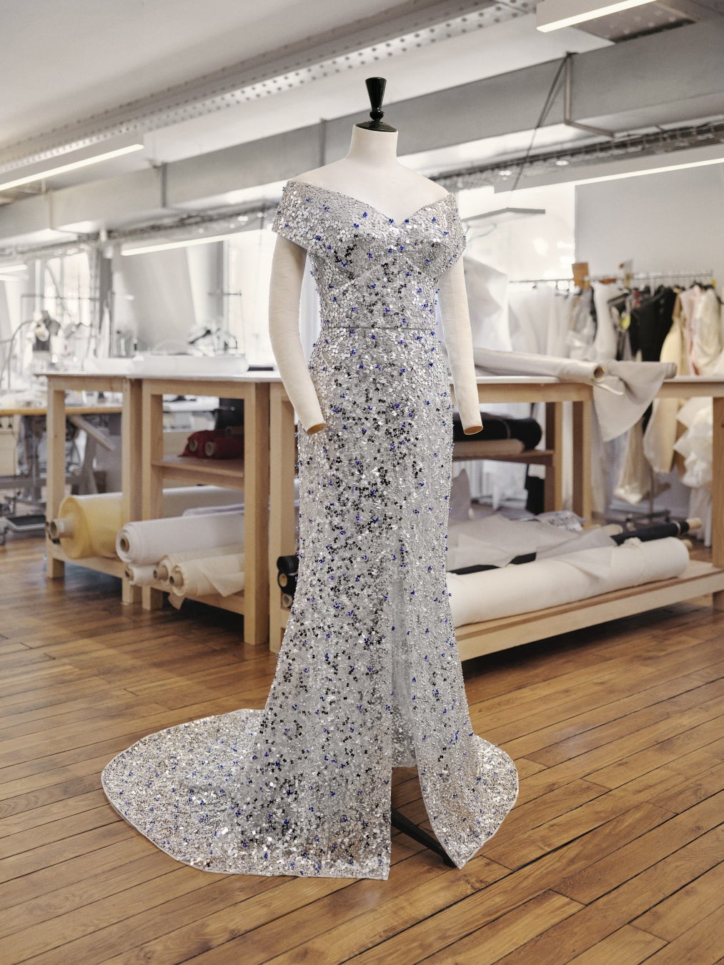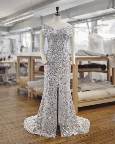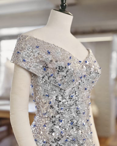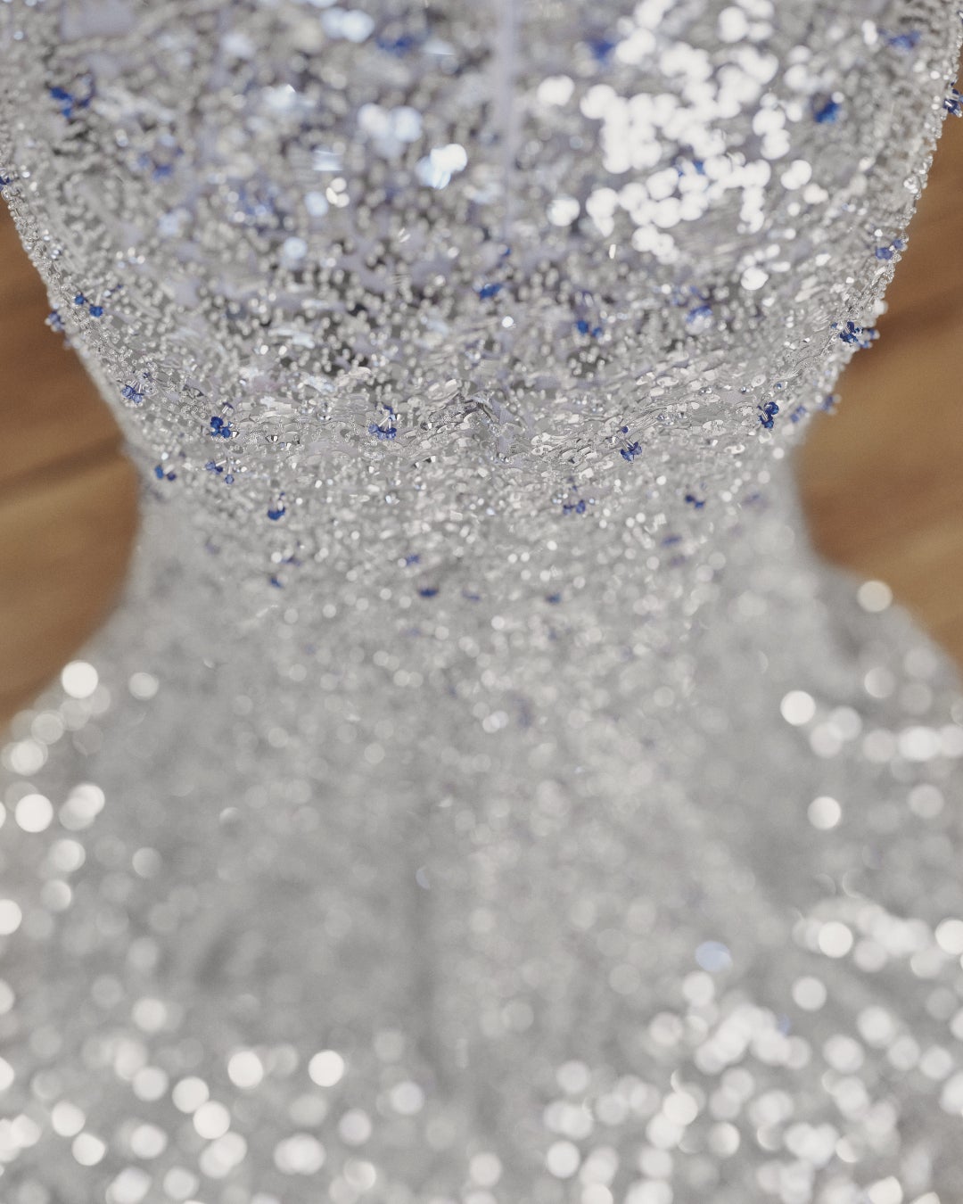 ドレスは幾何学模様のビスチェで、シルバースパンコールとブルークリスタルビーズで豪華に装飾され、制作に350時間、手刺繍に1500時間を要しました。