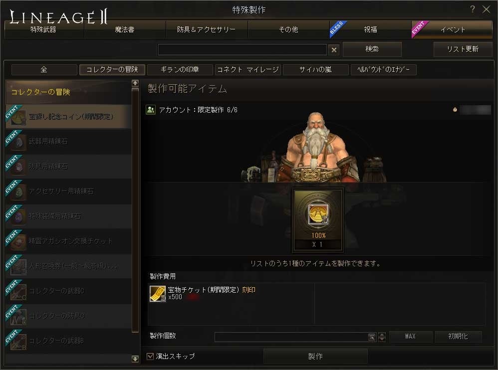 アデンサービスでは「コレクターの冒険」で宝物チケットを使ってアイテムを入手し、EXP/SPを増加させるイベントがあります。