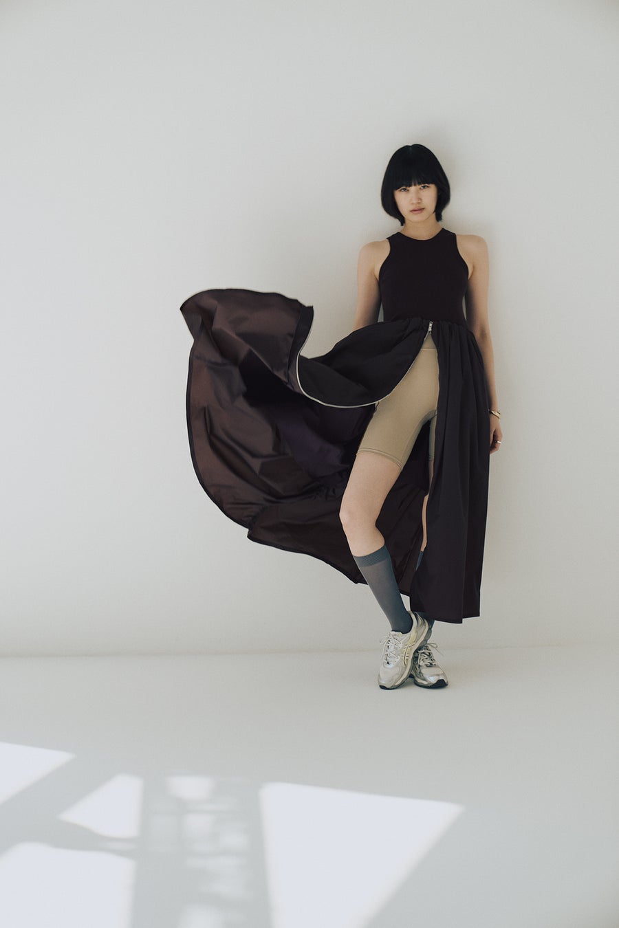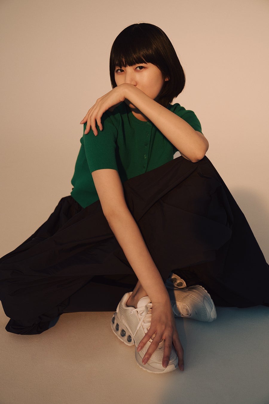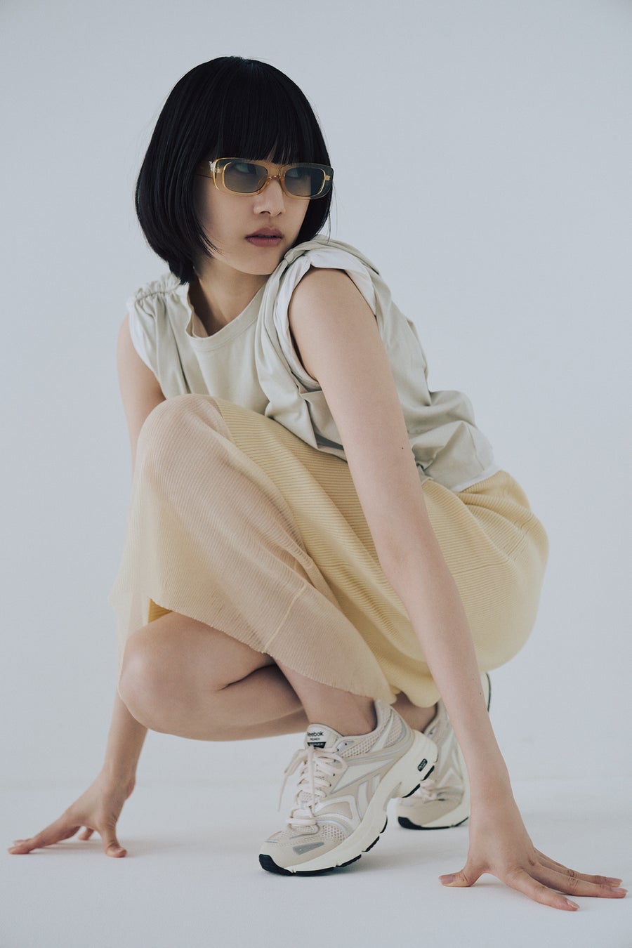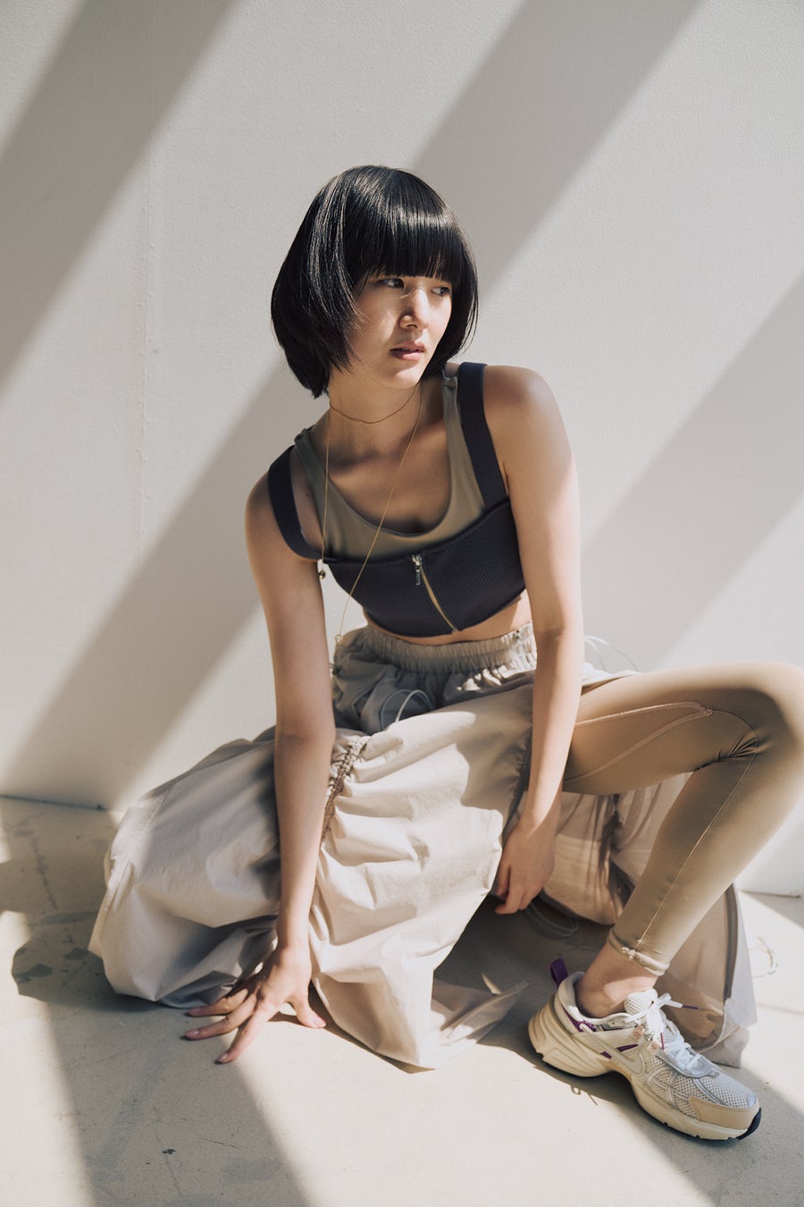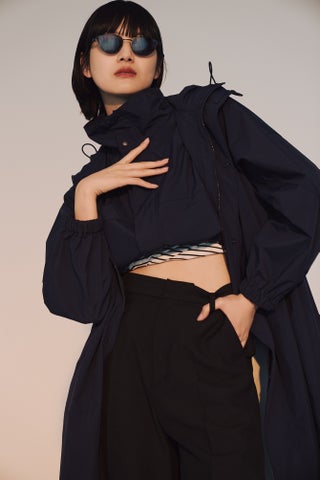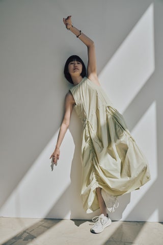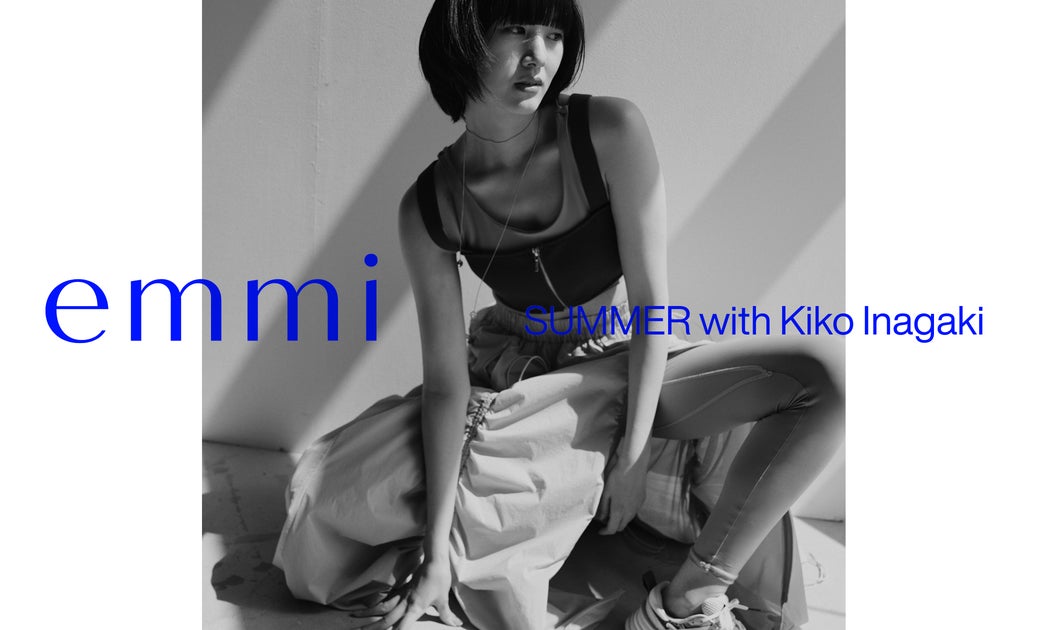 emmi SUMMER with 稲垣貴子が提案する夏のアクティブファッションは、シースルーやスポーティディテール、ミニマルフォルムなどの注目デザインを取り入れ、実用的な機能素材を使用しています。