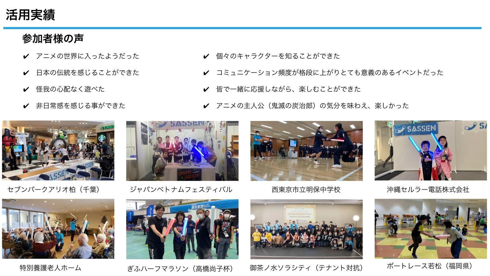 SASSENは定期的に体験会や公式大会が開催されており、子供向けレクリエーションや健康増進目的の健康講座などもある。