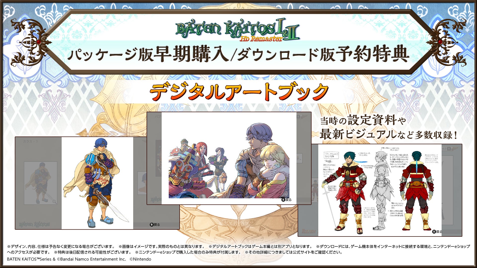 ※「ミニアートブック」の収録内容はPKG版早期購入特典/デジタル版予約特典「バテン・カイトス デジタルアートブック」からの抜粋となります。また、ページごとのイラスト掲載枚数・レイアウト等の構成が異なります。