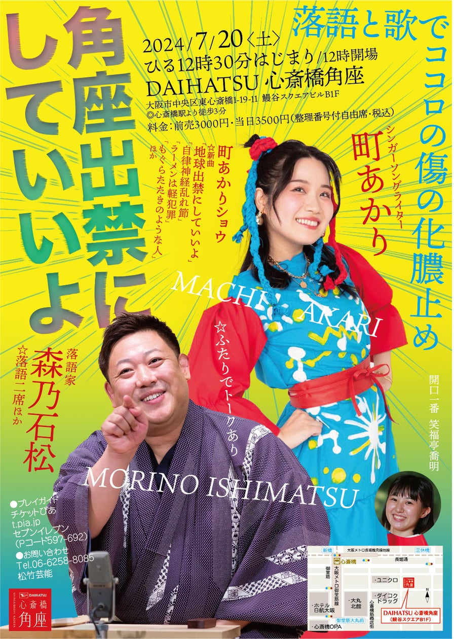森乃石松がDAIHATSU心斎橋角座で開催するイベント「角座出禁にしていいよ ~森乃石松×町あかり 落語と歌でココロの傷の化膿止め~」は、2024年7月20日に行われます。