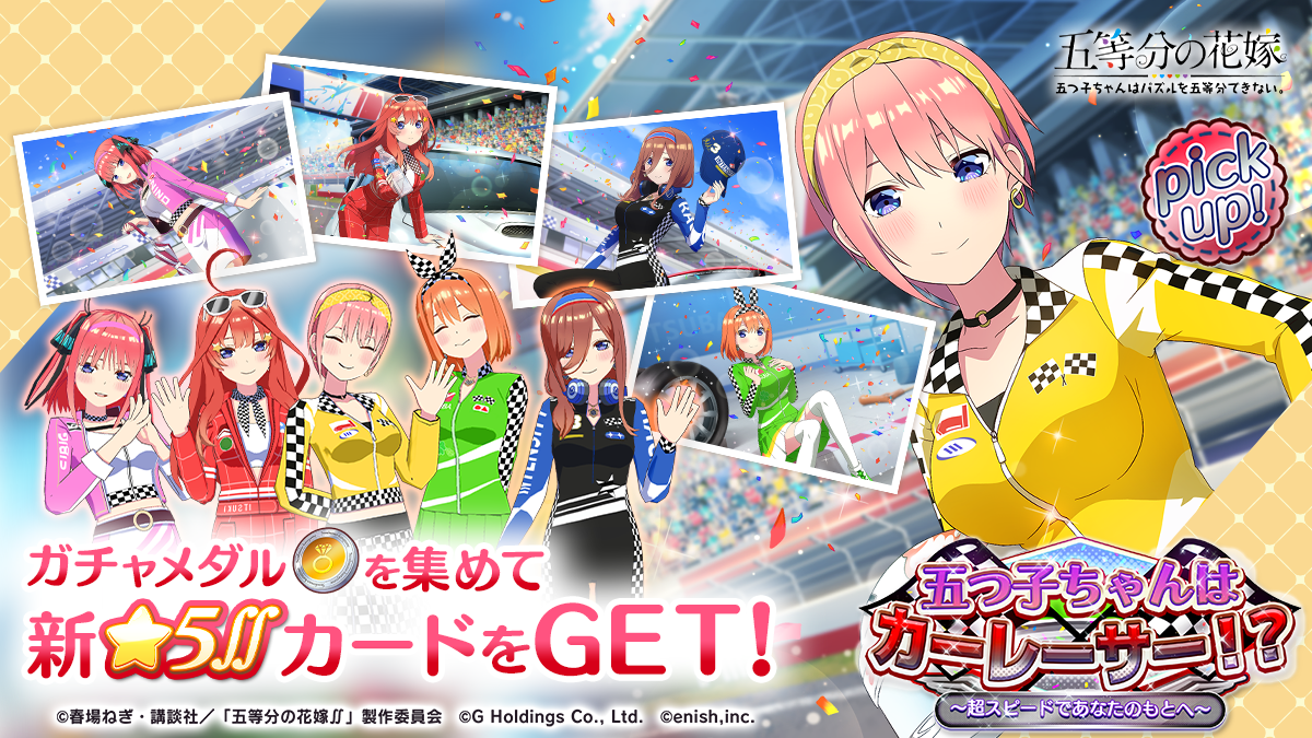 - 「五等分の花嫁」初のゲームアプリ『五つ子ちゃんはパズルを五等分できない。』に新イベント「五つ子ちゃんはカーレーサー!?」が開催される。