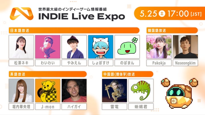 番組はインディーゲームを紹介し、日本語・中国語・英語で同時放送されます。